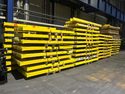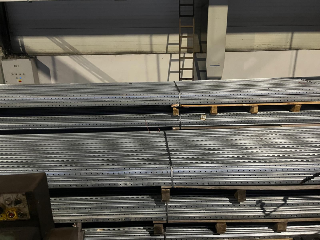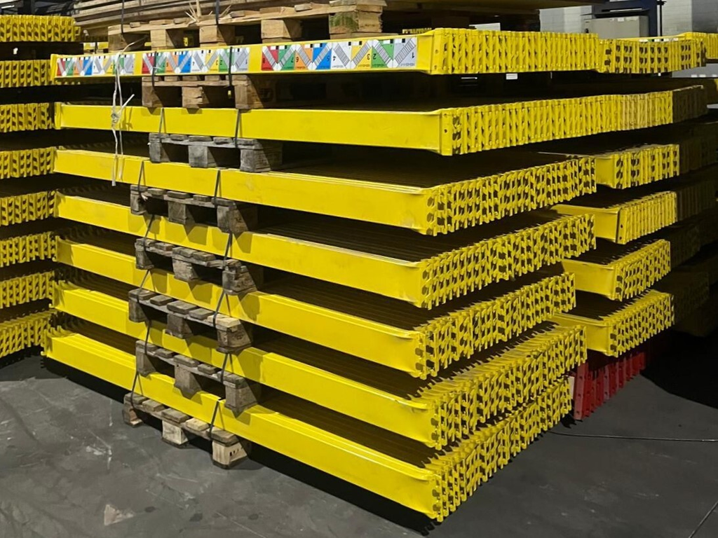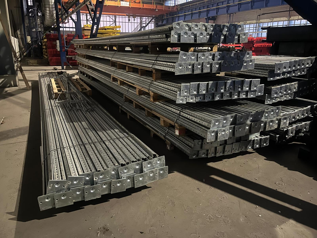 Regály jsou demontované, uložené na paletách, připravené k nakládce.