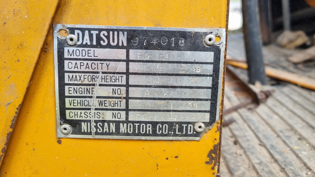 - Vysokozdvižný vozík DATSUN, nosnost 1650 kg, pohon benzín/LPG, výška zdvihu 4040 mm, rok výroby nenalezen, ale dle typu počátek 80. let