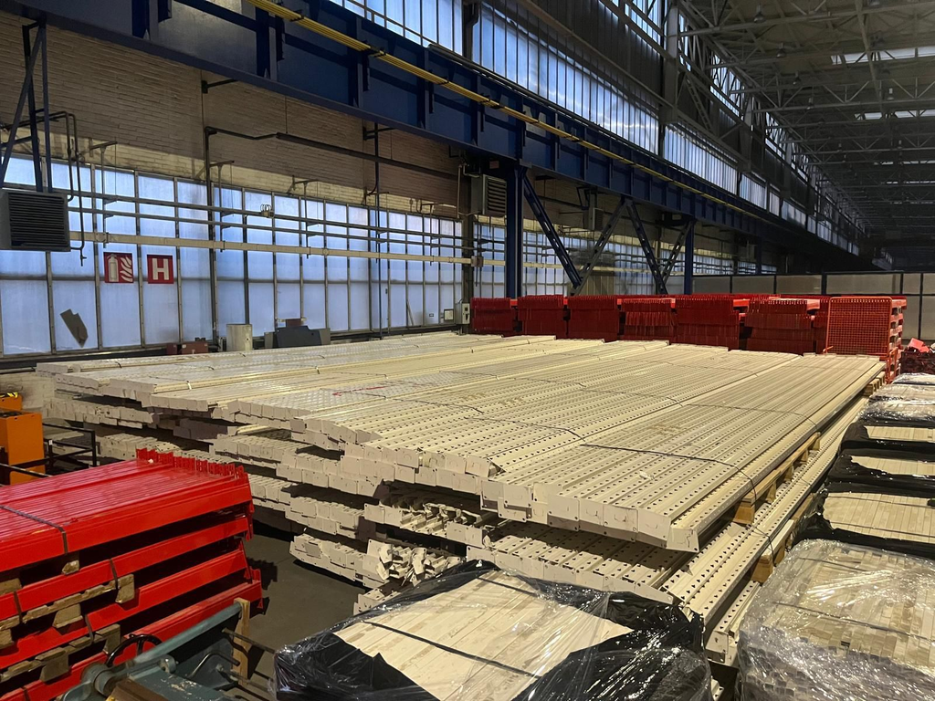 Regály jsou demontované, uložené na paletách, připravené k nakládce.